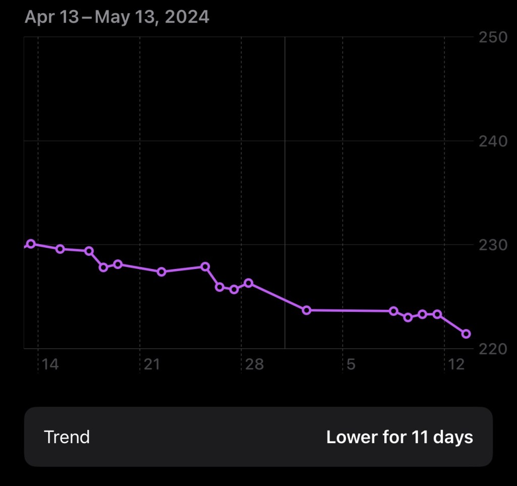 How – Really need to cut back on the sugar and get back into veggies leading meals. Better choices when eating out and reduce snacking. There is an exercise element here as well. Being darker makes it harder to get some disc golf and walks in during the week. Will need to keep going on indoor runs and weekend activities.