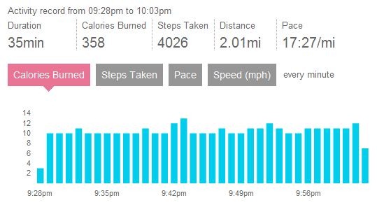 week. The good news is that this will require a steady increase and variety of things keeping me out of a chair. This week I still did some swimming, a bit of walking, mini-tramp time but added some basketball practice and some basic soccer running and shooting. Basically stuff to keep things interesting. I think the numbers get a bit falsely elevated when I am on the mini-tramp, so I need to keep that in mind, but the numbers for Saturday are pure walking, I took advantage of times that I would normally stand around and walked. Walked, walked and walked. I logged more than 19,000 steps – pretty happy with that.