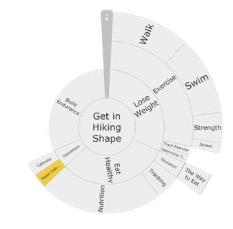 about what I could do if I accomplished my health targets. And that is how I mapped out my approach. My goal is to “Get in Hiking Shape”. The image to the left is from a tool called Goalscape. It is a visual way to develop and track progress on goals. My thoughts on how to be successful revolve around three main areas. The first is to lose weight. This means exercising – burning calories that have been saved up over the years. I will start with walking, swimming and stretching properly. This will help get me back into shape to consider additional types of exercise. The second area is all about eating properly. There is education that needs to occur as well as changing my eating habits. What, when and how much. I will be tracking my activity in order to see what I am really eating as well as a way to ensure I stay focused. For any that employ GTD, you know a huge part of success is psychological. Getting your head right with what you are attempting to do – the tracking and journaling will be a part of that for me. The third area will be focusing on endurance. This is really geared towards the main “Get in Hiking Shape” goal. I have not put a lot of thought into what I will do there as I need to get the first two in real control before I go too deeply.
